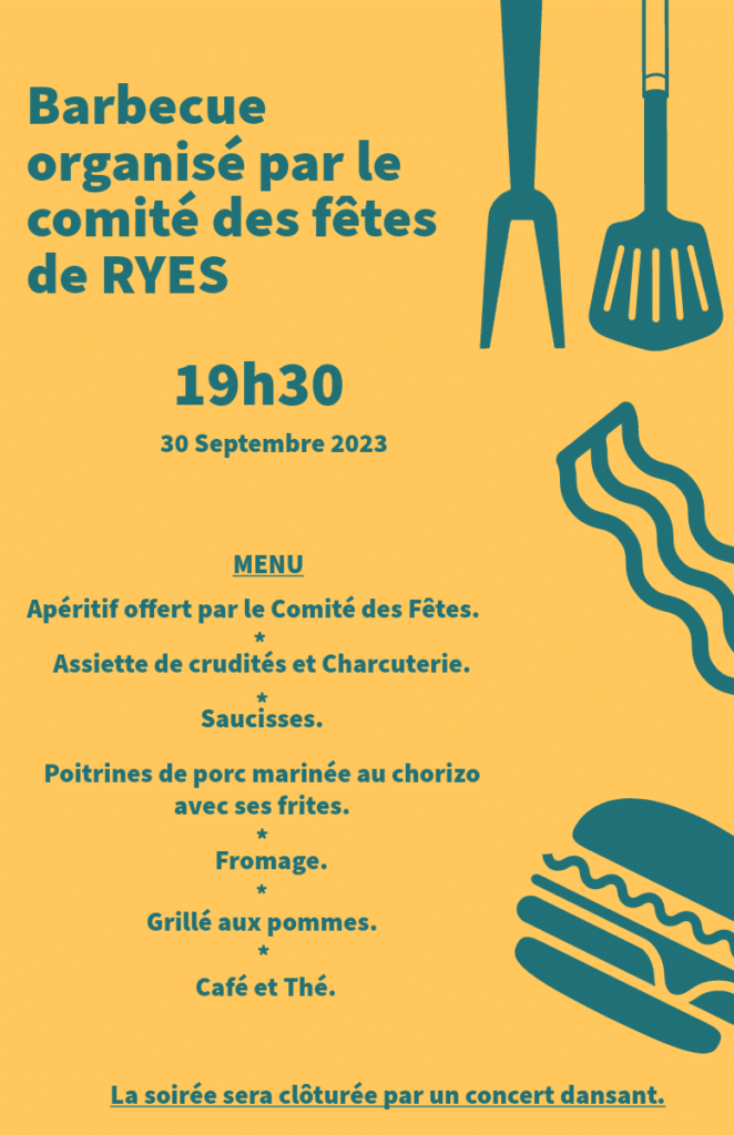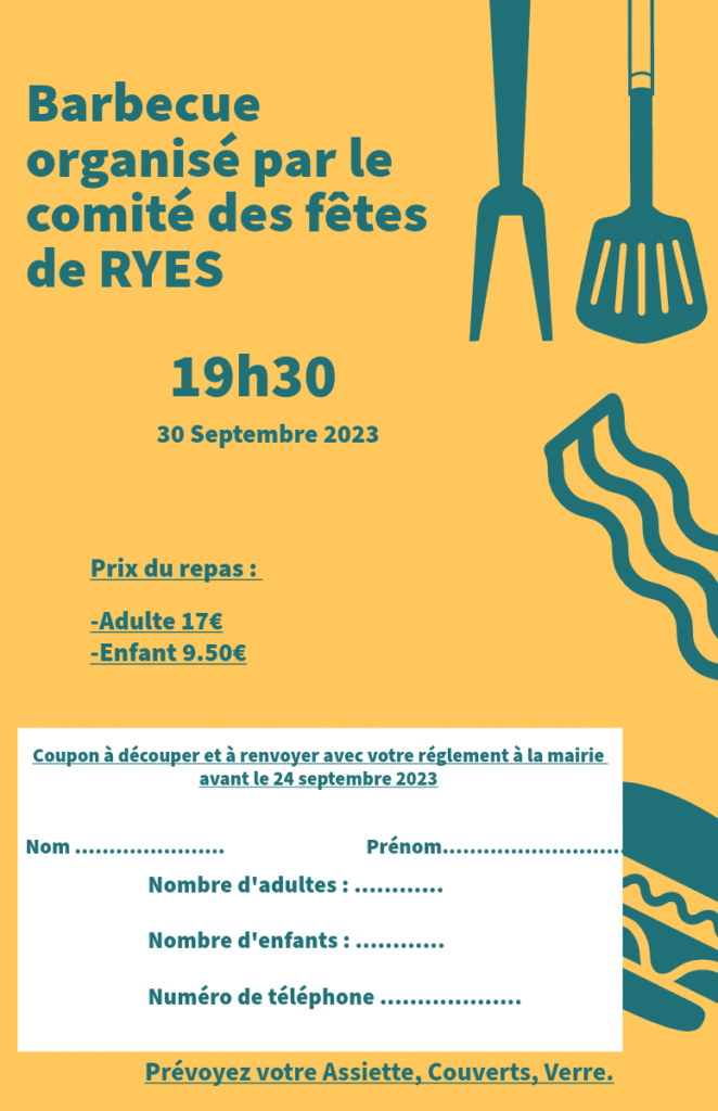 Barbecue organisé par le comité des fêtes de RYES Vous devriez également aimer Flâne’Ryes en rose 25 septembre 2024 A LOUER 1 novembre 2024 VENTE BUREAUX D’ECOLIERS 24 juin 2025